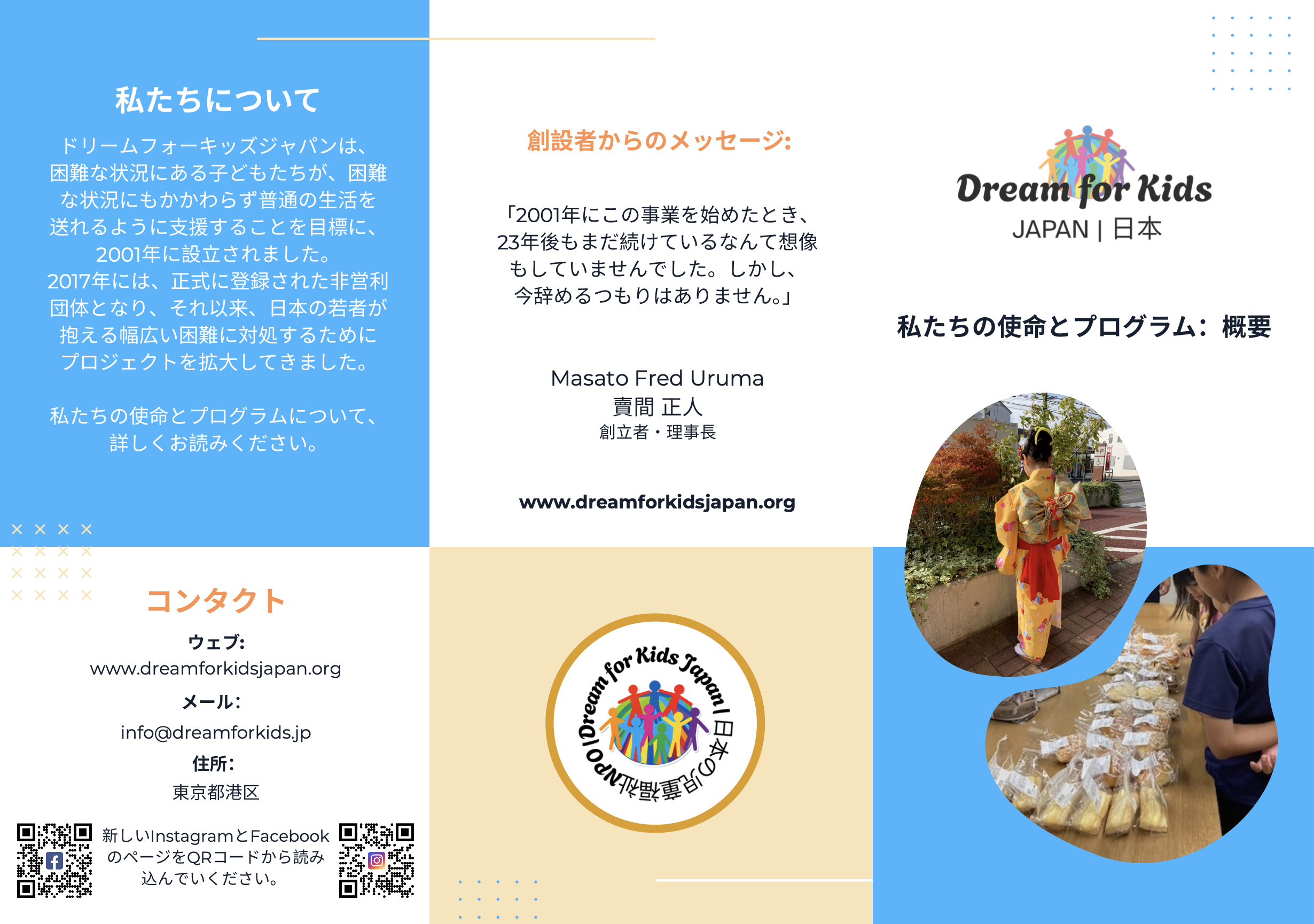 31 3月 ドリームフォーキッズジャパン Posted at 15:15h in 活動報告 by Liana 0 Likes JP Dream for Kids Japan Brochure-2ダウンロード