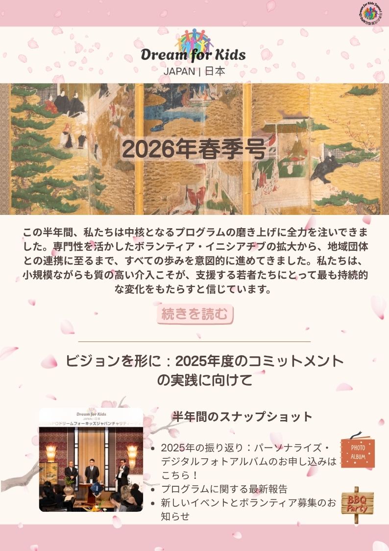 07 4月 2026年度 春ニューズレター発行のお知らせ Posted at 14:38h in 活動報告 by Liana 0 Likes ドリームフォーキッズジャパン 2026春のニュースレターダウンロード