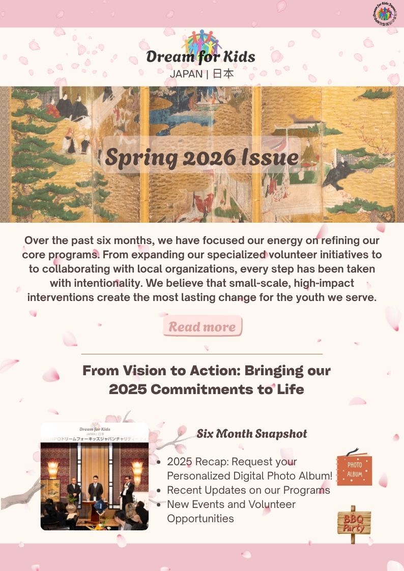 07 Apr Notice of Spring 2026 Newsletter Publication Posted at 14:33h in Latest Efforts by Liana 0 Likes Dream for Kids Japan Spring Newsletter 2026-3ダウンロード